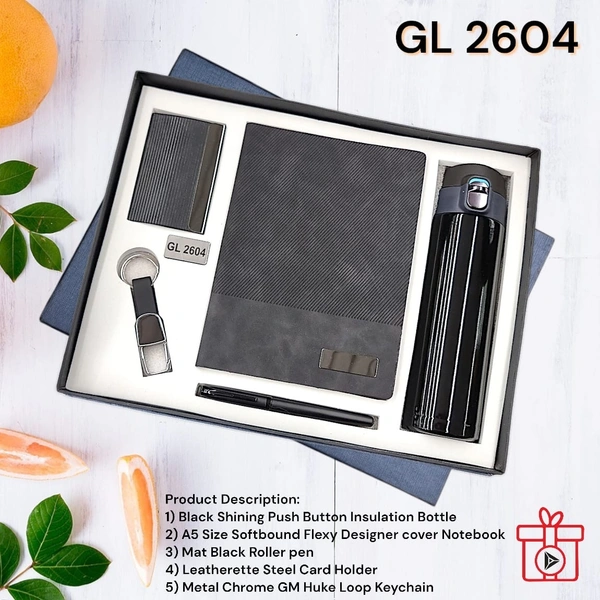 Mid Night Black 5 in one Welcome Kit { (a) Metal Ball Pen (b) Leatherette Steel Card Holder (C) A5 Flexy Notebook (D) Metal Huke with Leatherette Loop Keychain (E) Insulated Push Button Open Water Bottle